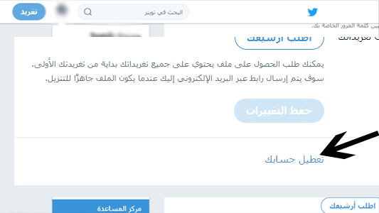 في الصفحة الإعدادات والخصوصية قم بالنزول للآخر حيث يوجد خيار تعطيل الحساب قم بالضغط عليه ثم سينتقل بك لصفحة يبلغك فيها تويتر بنصائح قبل تأكيد عملية الحذف التي تود القيام بها ، وأنه سيتم تعطيل حسابك لمدة 30 يوم قبل عملية الإزالة النهائية ، قم فقط بالضغط على تعطيل الحساب وأكد ذلك بكتابة كلمة المرور الخاضة ثم مباشرة سيتم تسجيل الخروج التلقائي من الحساب.