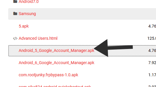 الان وبعد الدخول الى متصفح الهاتف ، ستقوم بالتوجه الى هذا الرابط ثم من خلال المجلدات التي تظهر لك بصفحة هذا الموقع ستقوم بالدخول الى مجلد Apps ، ثم مجلد FRP كما في الصورة التالية ، ثم ستختار ملف Android 5 Google Account Manager لتحميله كما تم التحديد في الصور التالية.