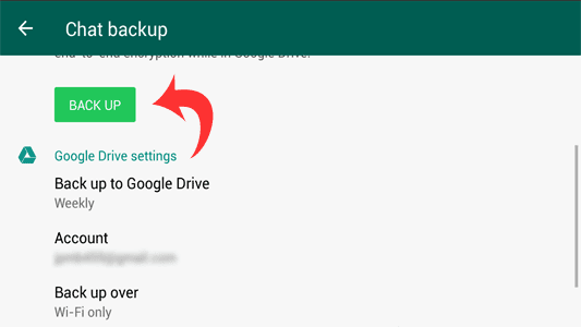 هذه الطريقة شبيهة جدا بطريقة النسخ اليدوي بحيث أنك ستقوم أولا بعمل نسخة احتياطية على خدمة جوجل درايف المربوط باميلك الخاص ، قم بالتوجه مجددا الى اعدادات تطبيق الواتس اب واضغط على خيار Chat ثم Chat Backup ثم في خيار Google drive settings ستختار هذا الخيار المبين في الصوة التالية ، ثم مباشرة تضغط على BACK UP وانتظر الرفع الى خدمة جوجل درايف.